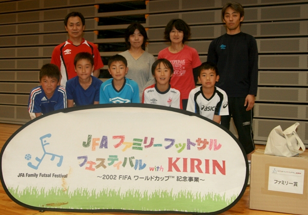 フットサル賞を獲得した「和田FCピーチ」は柘植幹仁(よしひと)代表(46)一家3人と、山本奈奈さん(38)一家3人の計6人で戦った。この日のベストプレーは山本家の次男大地君(小3)のゴール。「あこがれの選手は長友佑都選手。ボールをゴール前にグイグイ運ぶところが好き」と話し、全員6年生で固めてきたチーム相手に、サイドからのセンタリングをインサイドキックで決めた。