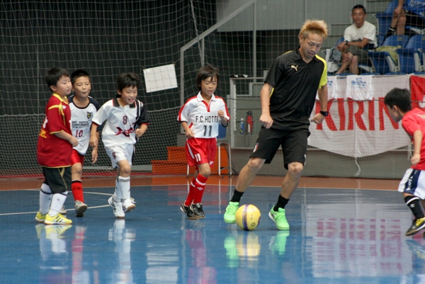 JFAスペシャルインストラクターで元フットサル日本代表の藤井健太さん(35)による「キリンフットサル教室」が、午前の部終了後、大会に参加したチームの小学生約80人を対象に行われた。 実技をはじめる前に藤井さんは、「フットサルは楽しくやること。人の話をちゃんと聞くこと。そして、よく考えてやろう」と子どもたちに語りかけた。全員で準備運動で体を動かした後、2人組になってボールを奪い合ったり、7人グループでドリブルのリレー。さらには2個のボールを同時にドリブルするなど、遊びの要素も取り入れ楽しい指導が続いた。岡崎市から参加した川西啓介くん(10)は、大樹寺小学校のサッカークラブのレギュラー。「藤井さんが言うように、話しをちゃんと聞いて、もっとうまくなりたい」と話した。最後はグループ別に藤井さんのコーチチームと対戦するミニゲームを楽しんだ。