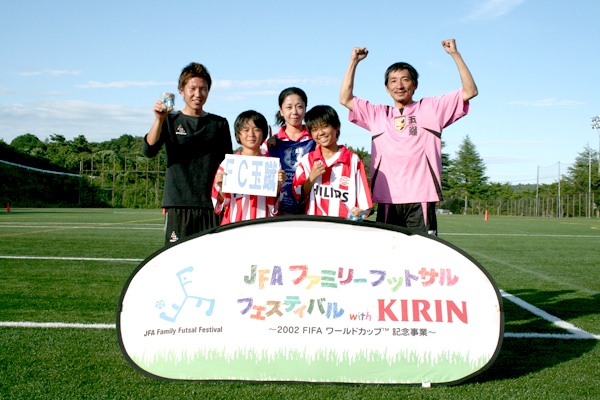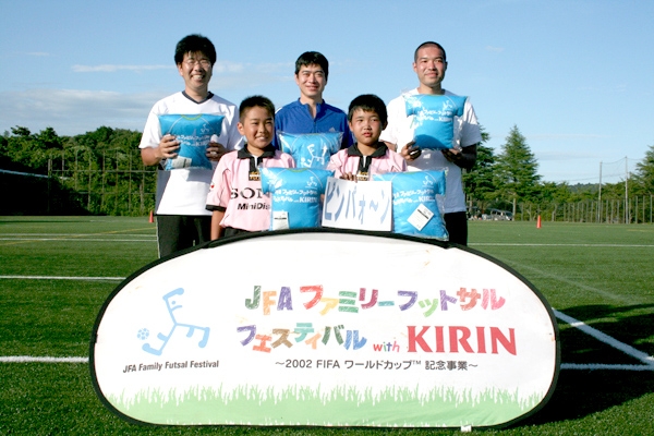 フェスティバル賞のFC球蹴(たまげった)は、青森市からの参加。メンバーは福士賢一代表(43)一家3人と子どもの友だち、代表の知人の5人編成。福士代表と山田秀哉さん(26)はフットサル社会人リーグの仲間、福士奈美さん(33)は県のミックスフットサルリーグで2年連続の女子得点王、福士一朗君と大木皓聖君(ともに小学6年)は以前同じサッカー少年団でプレー。今は大木君が山形県に転校して、久しぶりの再会となった。