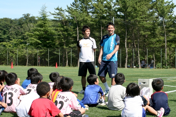2人は「いっぱい失敗してもいいから、積極的にチャレンジして」とハッパをかけていく。足の裏で止め、ターンして抜け出す「マルセイユ・ルーレット」や足で止めたあと左右に振る「エラシコ」、スペインの必殺技「ダブルタッチ」などを次々と伝授した。最後はゲームでおさらい。「1分1秒を大事にして少しずつ努力していけば、我々を抜ける」と激励していた。