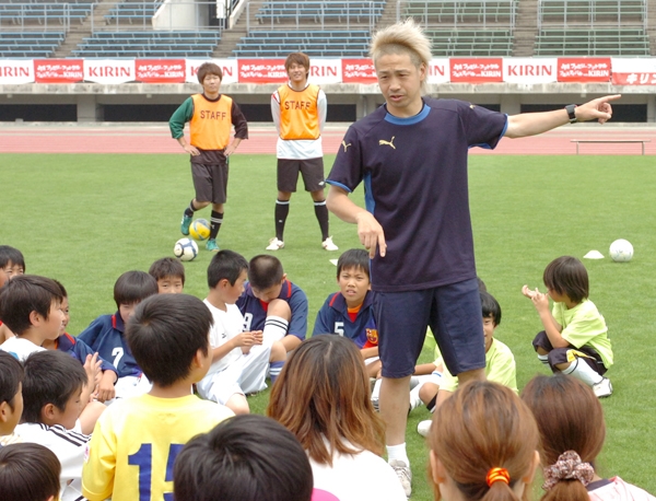 昨年現役を引退し、今年からJFAスペシャルインストラクターを勤める藤井さんは、子どもたちの指導も現役時代からスクールなどで経験済み。軽妙なトークと現役時代そのままの軽快なフットワークで子どもたちの人気を集めた。準備運動からドリブルや細かいステップなど、終始ユーモアを交えて指導し子どもたちの笑顔も絶えなかった。最後の全員が参加したショートゲームでは、予定時間をオーバーするほどの熱血指導が続いた。
