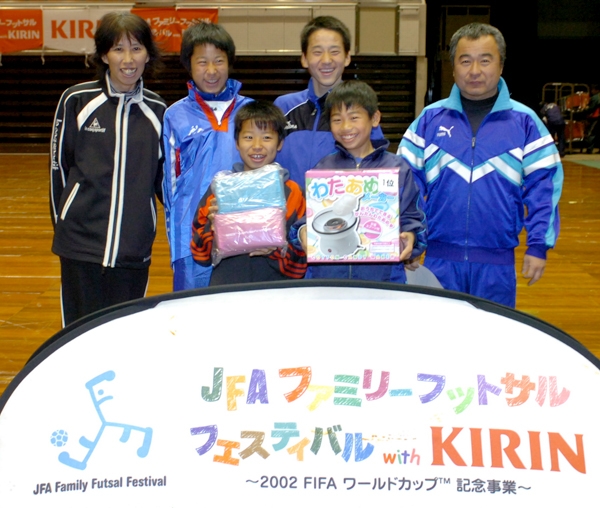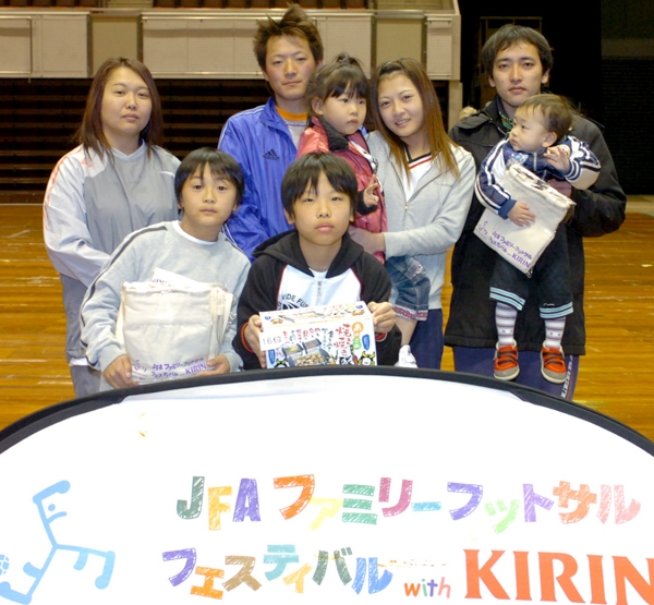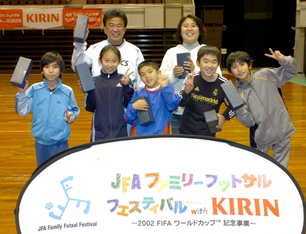 家族の触れ合い、ボールを蹴る楽しみを味わうことをテーマに開かれる「JFAファミリーフットサルフェスティバル2010 with KIRIN スペシャルステージ in 神戸」が1月23日、ポートアイランド(神戸市)の「ワールド記念ホール」で開催され、約300人が参加した。表彰式では成績順位発表とあわせて、勝敗にかかわらずフットサルを大いに楽しんだ「エンジョイFA」がファミリー賞を授賞。そのほか「離宮道」にフェスティバル賞、「斗稀部長倶LOVE」にフットサル賞がそれぞれ贈られた。