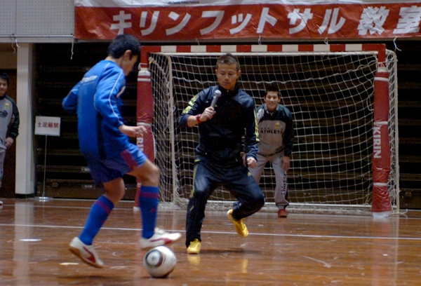 元フットサル日本代表でJFAスペシャル・インストラクターの相根澄(さがねきよし)さん(37)による「キリンフットサル教室」が、午後からのアトラクションの前に開催され、参加チームの約80人の小学生たちがシュート練習やミニゲームを通じて、楽しく技術を学んだ。