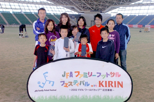 みんなの笑顔が弾ける!家族の触れ合い、ボールを蹴る楽しみを味わうことをテーマに開かれる「JFAファミリーフットサルフェスティバル2010 with KIRIN スペシャルステージ in 三重」が四日市ドームで11月23日開催され、16チーム約200人が参加して、元気いっぱいにフットサルを楽しんだ。表彰式では「A.I.U」がファミリー賞を受賞したほか、フェスティバル賞には「チームたるさか」、フットサル賞に「ZERO」が、それぞれ選ばれた。