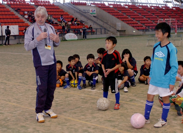 元フットサル日本代表監督でJFAスペシャル・インストラクターのアデマール・ペレイラ・マリーニョさん(56)による「キリンフットサル教室」が、大会に参加したチームの小学生約60人を対象に行われた。