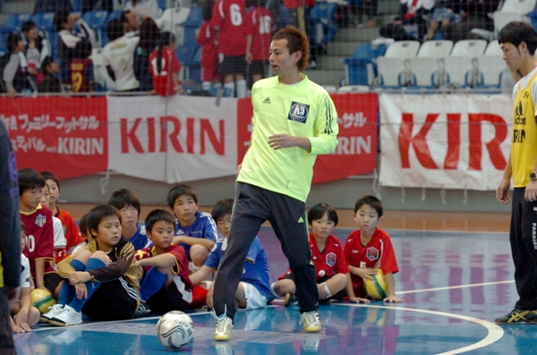 元フットサル日本代表でJFAスペシャル・インストラクターの相根澄(さがねきよし)さん(37)による「キリンフットサル教室」が、午前の部と午後の部の間に行われ、参加したチームから約60人の小学生たちが、楽しく学んだ。