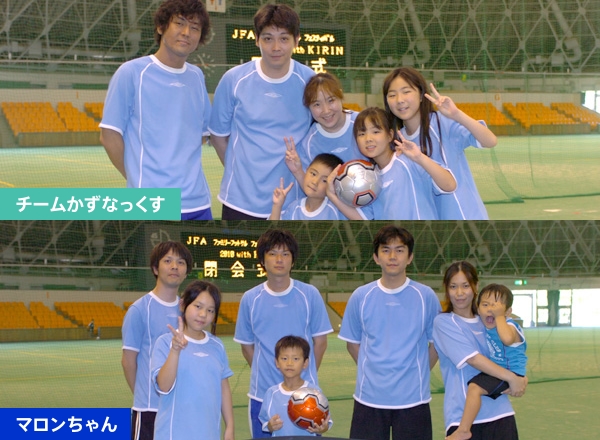 スペシャルステージらしく、今回は4家族が日曜日に集まり、フットサルを専門に楽しんでいるという〝フットサル大好き〟ファミリーグループが、大津から3チームに分かれてやってきた。その内の「チームかずなっくす」がファミリー賞。「マロンちゃん」がフットサル賞に輝いた。「チームかずなっくす」は田中秀和さん(35)千佳さん(32)勇歩さん(11)和奈さん(9)秀汰君(5)の5人家族に、いとこの滋賀寬嗣さん(32)の6人チーム。千佳さんは「始めたのは3年前、県内で年4回開かれるファミリー大会には全部参加している。フットサルは楽しい。子供との絆が深まるのがなによりだが〝チームメート〟になれるのが楽しい。それに、どこかに遊びに行くと言うことを考えなくてもいい」と笑った。和奈さんも「フットサルは楽しい。これからもずっとやりたい」と紅潮した顔で話してくれた。秀汰君は今年デビューだ。