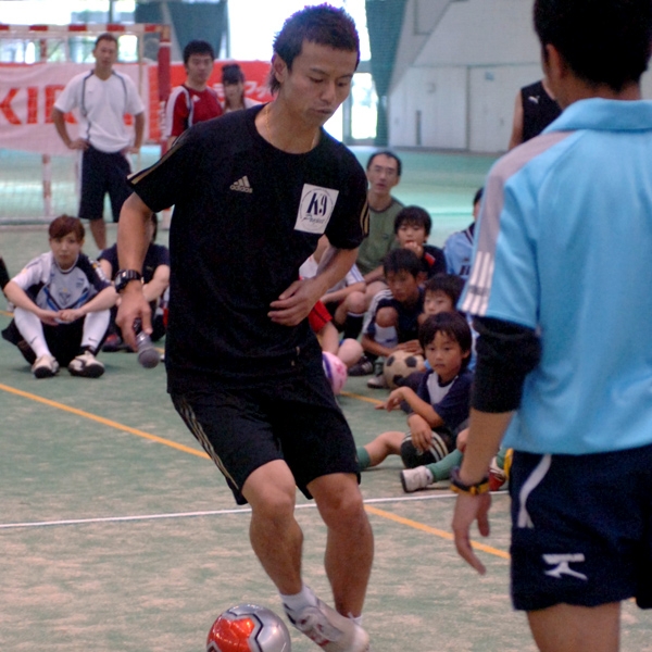 元フットサル日本代表でスペシャルインストラクターの相根澄(さがねきよし)さん(36)による「キリンフットサル教室」が行われ、小学生約80人が参加した。相根さんは「試合で一番うれしいことは点をとること。シュートがいかに、いい状況で打てるかということが大事」と、ドリブルしながらディフェンスをかわしてシュートをする練習から開始。最初は思い通りに挑んだ子供たち。その後ボールをまたぐようにしてディフェンスをかわす「シザーズフェイント」やアウトサイドボールを動かした方向にいく相手を抜き去る「エラシコ」といわれる高度なフェイントにも挑戦。「メッシやロナウドがボールをどこにおいているか思い出してください」と、先ごろのW杯でのシーンなどにも触れながら相根さんはアドバイス。また足の甲、ヒールを使ったシュートも練習した。「シザーズもエラシコもまあまあできた」と南郷里FVファミリーの平居紫音君(11)。日ごろの練習の成果に得意げだった。