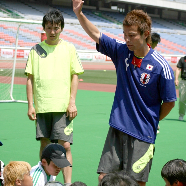 講師陣とのミニゲームでは、子どもたちに自分の好きな選手の名前を挙げさせ「自分がその選手になったと思ってプレーしよう」。メッシ、ルーニー、Cロナウド、中村俊輔などの名前が次々に飛び出した。参加者はあこがれの選手のイメージを頭に描きながら、熱戦を繰り広げた。