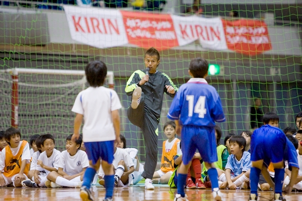 フットサル元日本代表でJFAアンバサダーの相根澄(さがねきよし)さん(35)による「キリンフットサル教室」が、交流戦の合間に行われ、小学生約100人が参加した。最初は広いピッチをかけまわる遊びを取り入れながら試合感覚を体得していく。続いて3人1組でボールをコントロールする練習。さらにドリブル、フェイントのかけ方に取り組む。「3人で考えて、話し合ってボールを動かして」と相根さんは熱血指導。「上手くできた人、出来なかった人もいると思う。だからこそ普段たくさん練習する事が大切」と子供たちにアピール。その後は相根さんと世界の舞台で鍛えた選抜チームが子供たちと実戦。ボールを追う子供たちに相根さんチームの華麗な足技がくり出され子供たちも必死に挑んでいた。終了後は試合のチケットをプレゼントされ大喜び。宮ファミリーズの松原司君(小3)は「ドリブルしながらのパスが勉強になった」と話していた。