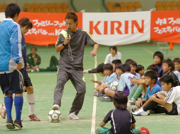 フットサル元日本代表でJFAアンバサダーの相根澄(さがねきよし)さん(35)による「キリンフットサル教室」が行われ、小中学生、お母さんら約120人が参加した。「上手くなりたいと思う人は、そうなれる。代表で活躍している人もそういう人が多い」と相根さん。最初は相根さんが指摘した色に向かって広いピッチをかけまわる遊びや後ろ向きで走ったり、合図でボールの取り合いをしながらゲーム感覚を養う。「見て、聞いて考えることが大事」とのアドバイスも送る。