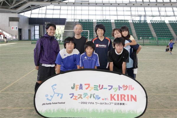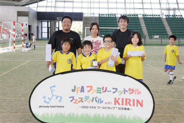 親子の絆も深まった!!家族のふれあい、ボールを蹴る楽しみを味わうことをテーマに開かれる「JFAファミリーフットサルフェスティバル2009with KIRIN スペシャルステージin四日市ドーム」(三重県)が13日開催され、リーグ戦とフットサル教室などで参加者は楽しい1日を過ごした。表彰式では勝敗に関係なくフットサルを楽しんだ「富田サッカー少年団C」にファミリー賞、「ラッキーちょんまげA」にフェスティバル賞、「タツトラV」にフットサル賞が、それぞれ贈られた。
