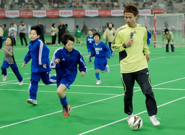 フットサルの楽しさと技術の向上を目的とした「キリンフットサル教室」が、午前と午後の試合の合間に行われた。講師にJFAアンバサダー相根澄さん(35)を迎え、Uー10の部の選手たち約200人が参加。相根さんは子どもたちと「しっかりと話を聞くこと」「常に考えて行動すること」を約束してから教室をスタート。ボールをうまくコントロールするコツや心構えなど、ミニゲームを通じてアドバイスした。教室に参加した拓北サッカー少年団の鈴木駿介君(10)は「(講師の)テクニックがすごかった。自分もまねできるように練習します」と感激していた。