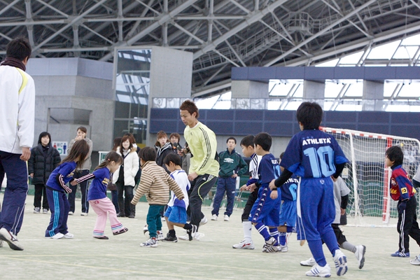「まずは楽しむことだが、後で後悔しないように自分から進んで楽しんで欲しい」という相根さん。最初はピッチを縦横無尽に駆け回る“感覚”をたっぷり楽しんだ。参加者はそんな中で体の移動、ボールに触れるテクニックを自然に体得していく。その後は相良さんら上級者との「全力プレー」の実戦、子供たちが積極的にプレーできるように、相良さん自らが世界の舞台で鍛えた華麗な足技を披露したり、時にはフェイントを交えたりしながら、適切なアドバイスを送った。子供たちも必死に“反応”しながらボールを追っていた。見事にゴールを決めた富田サッカー少年団Dチームの中瀬巧大君(小3)は「普段の力は、あまり出せなかったけど、ミニゲームは面白かった」と、息を弾ませながら話してくれた。