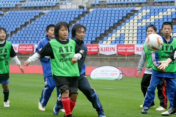 試合の合間に元日本代表MFでJFAアンバサダーの本田泰人さん(38)によるキリンフットサル教室が開催された。当初は雨のためメーンスタンド下のスペースを予定していたが、天候の回復もあってメーンピッチに変更され、本田チームと挑戦者チームに分かれたミニゲームを楽しんだ。本田さんは最後列に控え相手のパスをカットしたり、味方チームにアドバイスを送ったりと楽しそう。自らもドリブルで相手陣深くに攻め入るなど、妙技も見せた。5分ほどの試合を終えたあとは全員と握手、これを5、6試合行った。