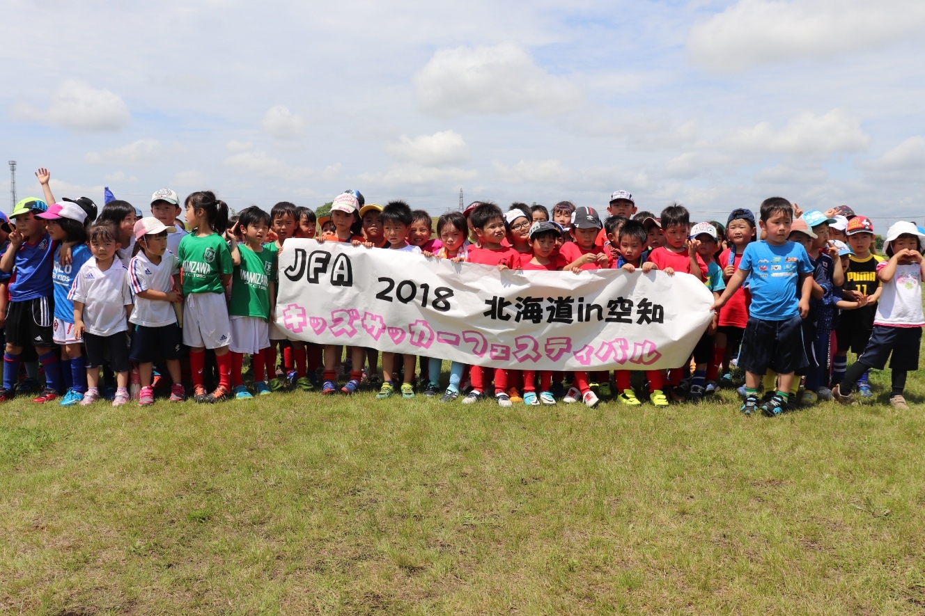 JFAキッズ(U-6)サッカーフェスティバルは、サッカーが好きな6歳以下の子どもであれば、だれでも参加できる楽しいフェスティバルです。2018年07月14日(土)に北海道岩見沢市にある「岩見沢市幌向緑地公園」にて90人が参加しました。