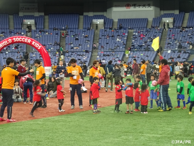 日本サッカー協会(JFA)はJFAグラスルーツ宣言で「障がいの有無に関わらず、だれもが、いつでも、どこでも。」というメッセージを掲げ、誰もがサッカーを身近に心から楽しめる環境づくりに努めています。2015年1月には障がい者サッカー協議会を立ち上げ、7つの障がい者サッカー団体とともに統括組織の設立に向けて準備を進めています。1月24日に京セラドーム大阪で開催されたJFAユニクロサッカーキッズでは、初めての試みとして聴覚障がいを持った子どもを中心としたチームにご参加いただきました。特別協賛社株式会社ユニクロの社員でデフサッカー日本代表選手である塩田知弘さんの呼びかけで集まった18人の子どもたちは、他のチーム同様に8人制のミニゲームを3試合行った後、キッズアトラクションへ移動し、ボールを使ったドリブルやキックなどのコーナーを体験しました。