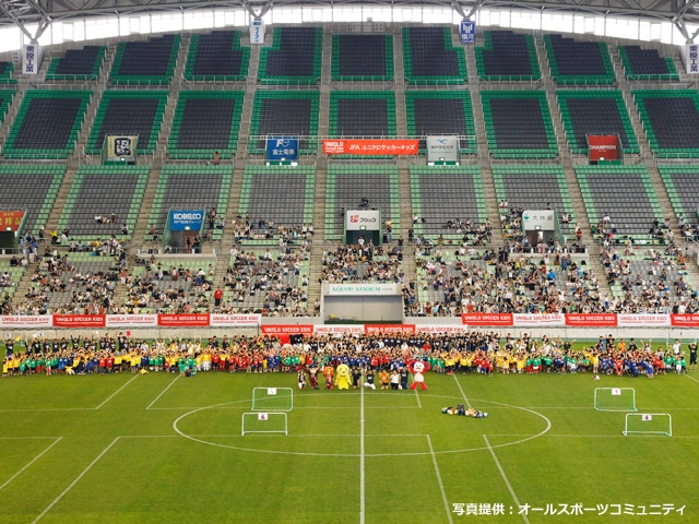 JFAユニクロサッカーキッズは、6歳以下の未就学児を対象とした、だれでも参加できる楽しいサッカーフェスティバルです。6月19日(日)にノエビアスタジアム神戸で開催し、1,042人の子どもたちが参加しました。兵庫県では昨年に続き3回目の開催で、ノエビアスタジアム神戸では2004年以来12年ぶりの開催となりました。スペシャルゲストの波戸康広さんをはじめ、チャレンジ1ねんせいの「コラショ」、ヴィッセル神戸の「モーヴィ」、INAC神戸の「らいむちゃん」、兵庫県の「はばタン」、神戸のキャラクター「コーベアー」、神戸市兵庫区シンボル・キャラクター「ハートン」のマスコットキャラクターたちも、ピッチでプレーする子どもたちに声援を送ったり、一緒に写真撮影をしたりとイベントを盛り上げました。