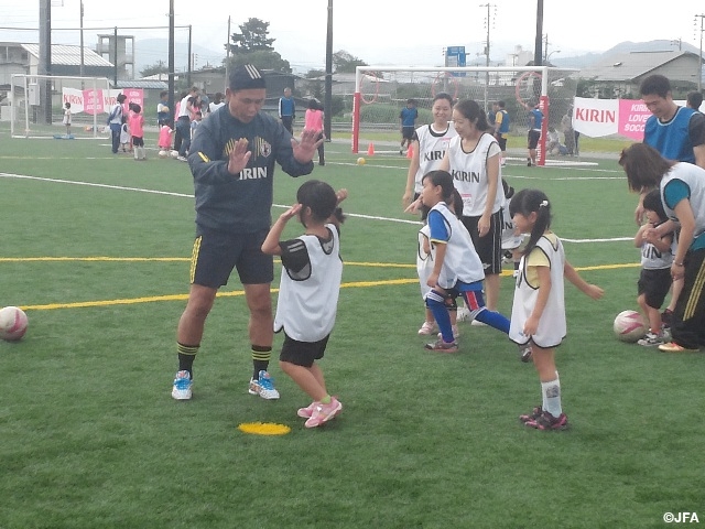 また、試合に先駆けて8月30日、佐々木監督と元なでしこジャパンの宮本ともみさんをゲストに迎え、米沢市営人工芝サッカーフィールドで「JFA・キリン レディース/ガールズサッカーフェスティバル」が開催されました。朝の部、昼の部、午後の部の3部制で行われたフェスティバルには初心者から経験者まで約600人が参加し、爽やかな風を浴びながらプログラムを楽しんでいました。