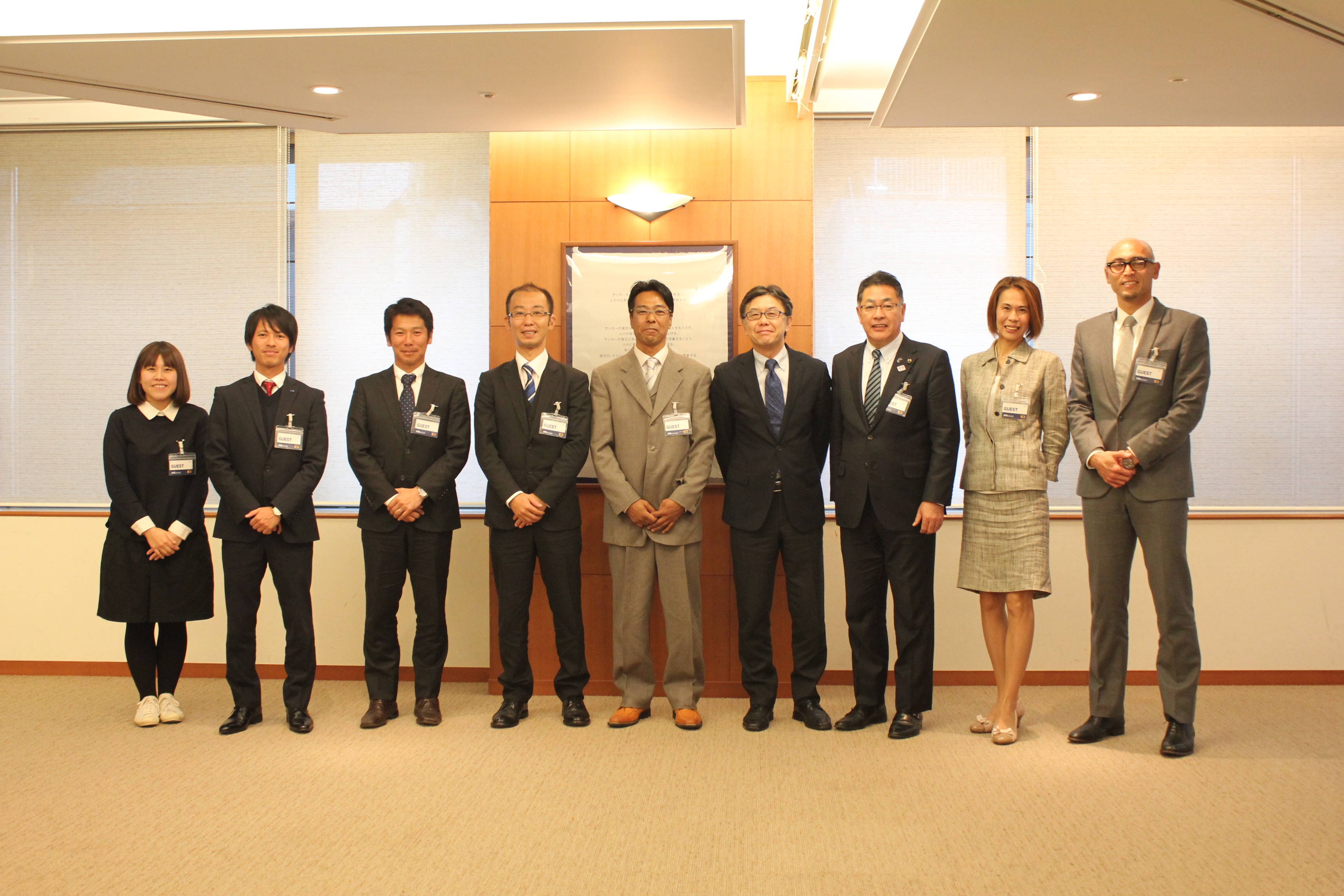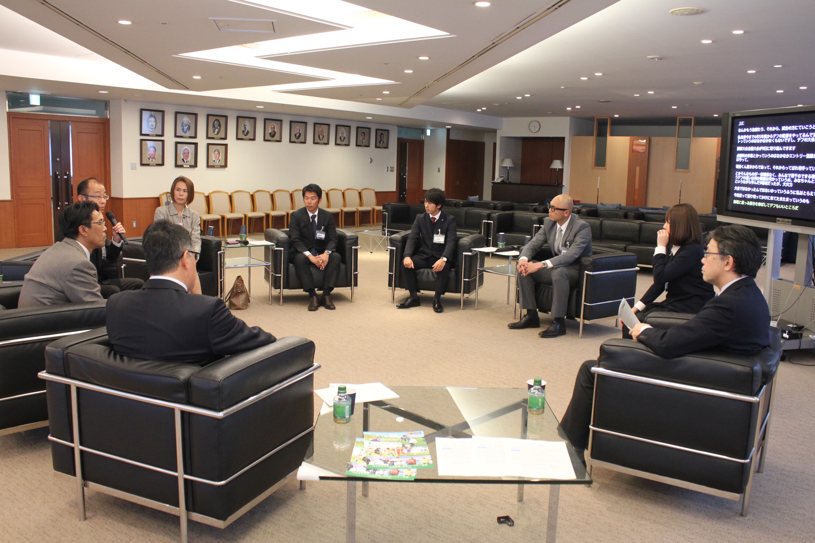 写真左から神奈川県デフフットボールクラブマネージャーの鈴木栄梨さん(通訳)、荒瀬氏、重田氏、武井氏、山道氏、松田氏、森氏、竹澤氏、箕輪氏