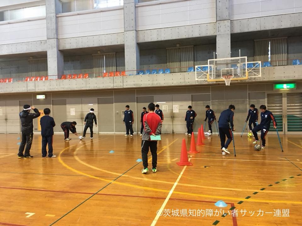 JFAグラスルーツ推進・賛同パートナー制度の「障がい者サッカー(だれでもJoin♪)」賛同パートナーである茨城県知的障がい者サッカー連盟は2017年12月2日(土)、茨城県行方市の麻生運動場体育館で、行方市主催の知的障害児・者サッカー教室に講師として参加しました。小学生から成人までの男女16名、ボランティアスタッフとして地元の玉造工業高校サッカー部の生徒12名、茨城県知的障がい者サッカー連盟スタッフ6名、地元の特別支援学校教員6名が参加しました。サッカー教室のほかに、ブラインドサッカーとアンプティサッカーの体験コーナーを設置し、空いている時間に参加者が体験を行いました。また、ボランティアで参加した地元の玉造工業高校サッカー部の生徒も体験を行いました。
