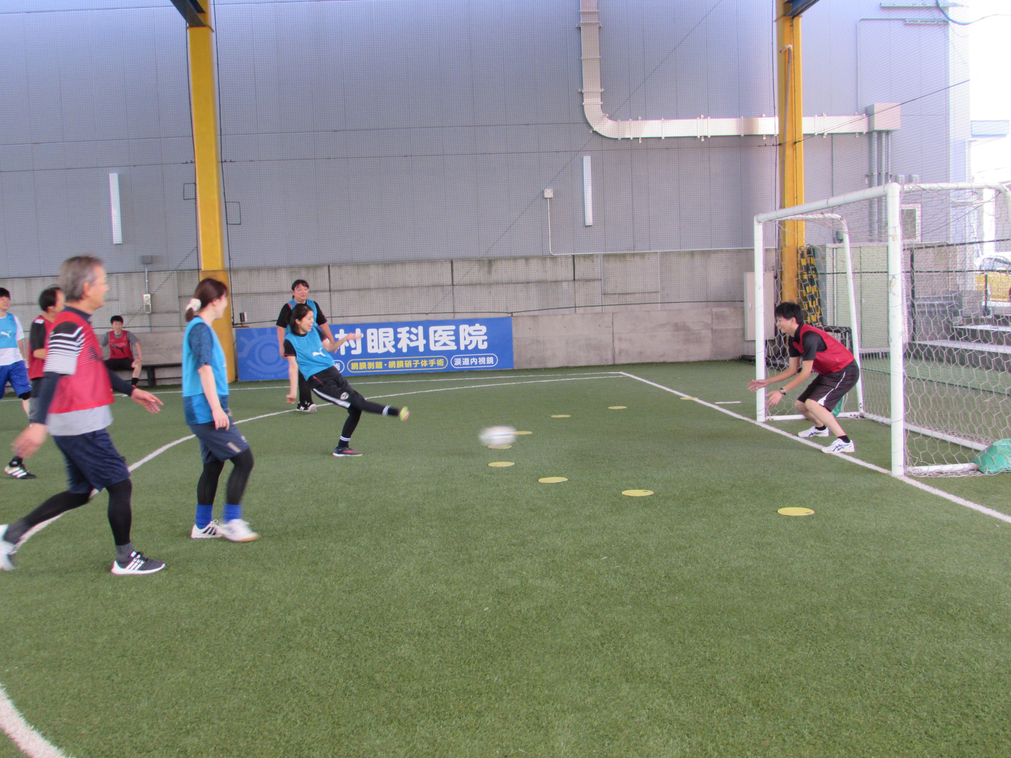 今回、松田薫二さん(日本サッカー協会 技術部 グラスルーツ推進グループ長)にも参加頂きウォーキングサッカーの楽しさや、日本サッカー協会の取り組みについてお話頂き、参加者の皆様も興味深く聞いて下さいました。今回の体験会は、参加者の中に接骨院の先生がいらっしゃいましたので。「正しい姿勢の歩き方」「正しいストレッチ方法」をお教えいただき参加者からは大好評でした。体験会内容は、アイスブレイク、ドリブル(ペンギン歩き)、パス、そして最後に試合を行いました。4チームに分かれてのリーグ戦では、恒例のエスパルスウォーキングサッカー独自のローカルルールをつくり面白おかしく試合を楽しんでいただきました(今回は「カラーコーン」をGK役として、カラーコーンに当たったらノーゴール)。積極的なシュートシーンが増え、カラーコーンに当たったら「ナイスカラーコーン(GK)」と笑い声が絶えない試合となりました。 試合の合間には、お菓子をつまんだり飲み物を飲みながら参加者同士で交流ができる休憩スペースもあり、ご自分のペースで無理なく楽しんで体験していただけたと思います。