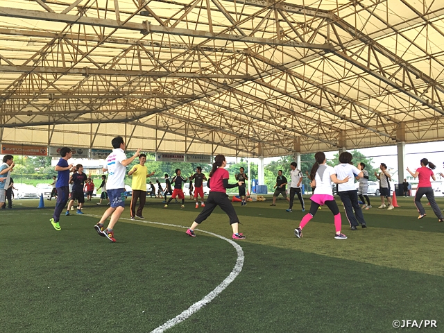 開講時は緊張していた様子の受講生も、アイスブレイクや講義を経て次第に和やかな雰囲気へと移り変わっていきました。講義では、子どもたちとの接し方や子どもたちへの伝え方などを学び、実技ではボールフィーリングやスモールゲームなどの実践を踏まえて、スポーツやサッカーの素晴らしさを体感した様子でした。