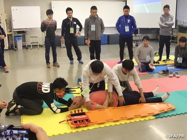 スポーツ救命ライセンス講習会は、他の救命講習会と比べて、近年サッカー競技に多く発生する脳震盪に関する内容が充実しており、熱中症の内容についても触れられていて興味深く聞くことができました。また、実技も胸骨圧迫、AEDについてはもちろん、頸髄損傷が疑われる場合に使用されるバックボードを使用した搬送方法も学べてすごく勉強になる講習会でした。サッカーに限らず、スポーツ現場ですぐに活用できるので、スポーツに関わる人には是非学んでもらいたい内容です。