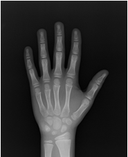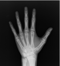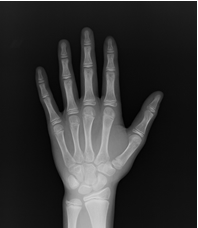 骨年齢を割り出す方法はいくつかありますが、基本的に左手のレントゲン写真(図)を使い、手を構成するいくつかの骨の形状から骨年齢を割り出します。