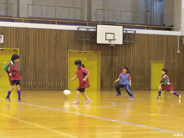 北海道の南、桧山地域を中心とし、経験の有無を問わず、また子供から大人までを対象としているので、技術的・体力的に差がある中で、サッカー・フットサルの専門的な指導というより、ボールを使って一緒に取り組める内容を考慮し、体を動かしてみよう!楽しもう!という内容をメインに実施しています。技術的な内容の際は経験者・未経験者を分け、難易度を変えて実施しています。広域であるにもかかわらず、経験者の参加も多く、また徐々に未経験者の方の参加が増えていることは大変ありがたく思っています。この活動によって地域の女子選手が増えていくこと。地元の女子チームやママさんチームへの普及につながるように続けて行きたいと思います。