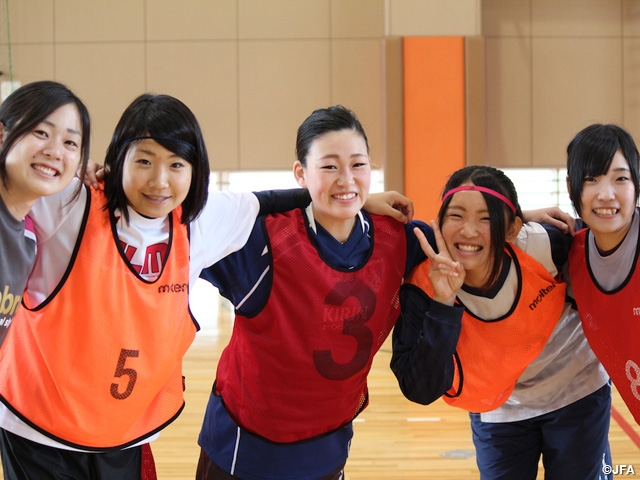 私は女子サッカー部に所属しているので、普段からサッカーとふれあう環境が多いのですが、今回のJFAなでしこひろばでは、サッカー未経験の友達と参加しました。最初は、「ボール蹴るの難しい。」と言っていた友達も、ゲームなど始めると無我夢中でボールを追いかけていて、シュートが決まると喜び、外してしまうと落ち込み、といった喜怒哀楽が絶えない環境だったので、すごく楽しかったです!