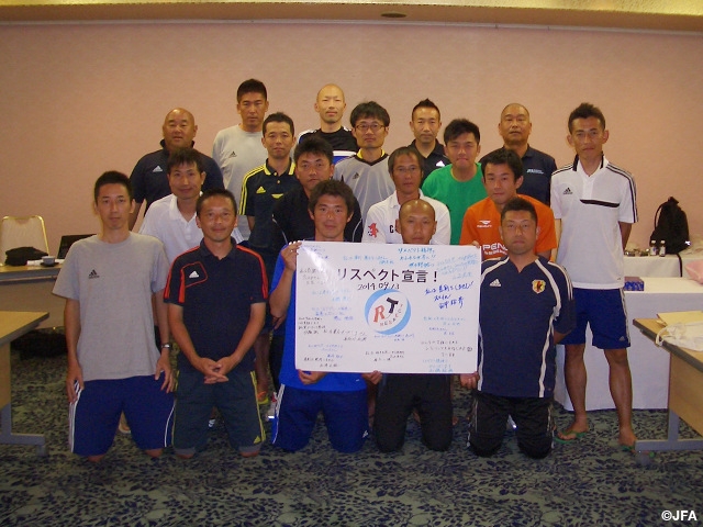 また、大会に併せて、全地域から集合したビーチサッカー審判員研修会を開催。研修会においても差別、暴力と闘っていく意思を示す「リスペクト宣言」を行いました。