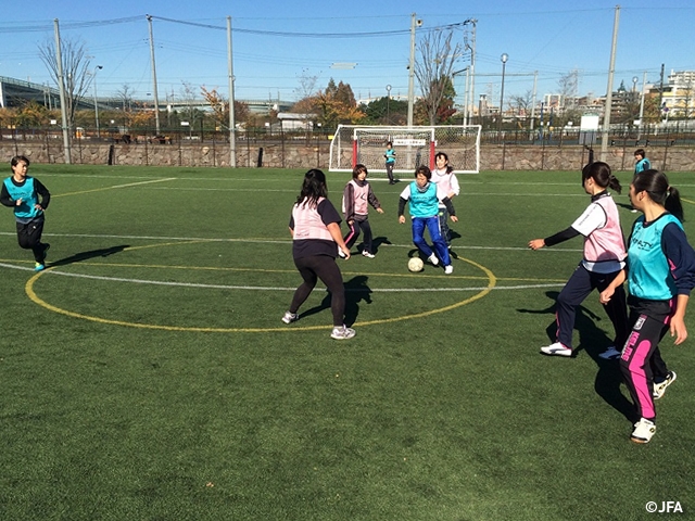 12月3日(水)、神奈川県横浜市で「NPO法人ウィニングドッグスポーツクラブ」主催のJFAなでしこひろばが開催されました。寒空の下、主婦の方々を中心に11名の参加者が集まり、まずはブラジル体操でじっくりと身体を暖めてからのスタートとなりました。普段から頭と身体を使ったインテグラルトレーニングを採用し、「見る」「考える」能力は向上していましたが、「実行」の段階になると思うようにいかないことが多くあったため、今回のテーマは「多彩なコントロールとキックの基礎」としました。基礎的な動きを反復して行う目的で、アナリティコトレーニングを採用し、2人1組でマーカーを使用してのコントロールとキックをテンポ良く15種類ほど行いました。体重移動やステップワーク、足裏を使ったコントロールを声掛けやデモンストレーションを通して集中的に取り組みました。