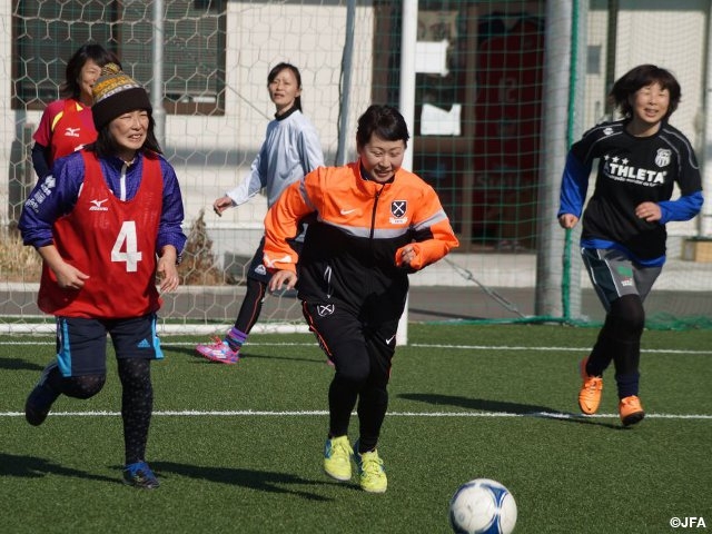 1月14日(水)、神奈川県相模原市で株式会社ノジマステラスポーツクラブ主催のJFAなでしこひろばが開催されました。今年最初のなでしこひろば開催となるこの日は天候にも恵まれ、笑顔があふれる明るい雰囲気の中でスタートしました。「鬼ごっこ」で参加者同士がコミュニケーションを取りながら軽く汗を流した後は、シュートトレーニングを行いました。参加者が強烈なシュートを打つたびに、「おぉーー!!」と大きな歓声が上がり、全員が心からサッカーを楽しんでいる様子が見られました。
