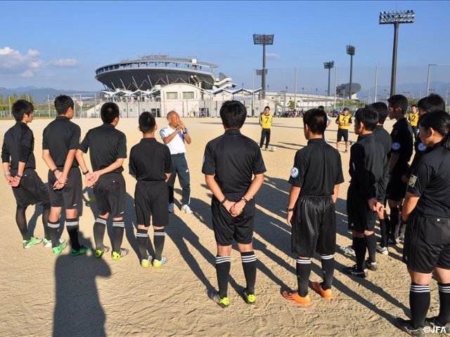 愛媛県の審判委員会では、審判員の発掘・育成・強化に向けてさまざまな施策を講じています。その一環として2009年に「審判トレセン」をスタートさせました。現在では一般、ユース、女子の三つのコースに分けて実施しています。