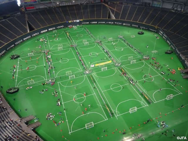札幌ドームのピッチでフットサルを楽しむこの大会は、屋外でサッカーをすることが難しい冬の北海道で、年齢、性別を問わず、さまざまな競技レベルの選手が一堂に会し、毎年この時期に行われています。第15回目となる今年は、北海道全域72の市町村から、390チーム、約5,000人が参加し、2月7日、8日と11日の3日間、13のカテゴリーで開催されました。この大会の模様は、月刊JFA TV 2月号でもご紹介しています。
