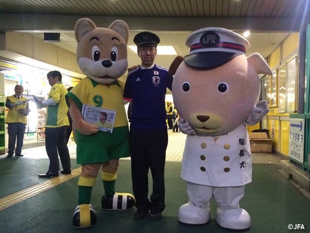 昨日は、JR東日本千葉支社マスコットキャラクターの駅長犬も試合会場となるフクダ電子アリーナの最寄り駅である蘇我駅に駆けつけ、U-22日本代表チームへの応援を呼びかけました。