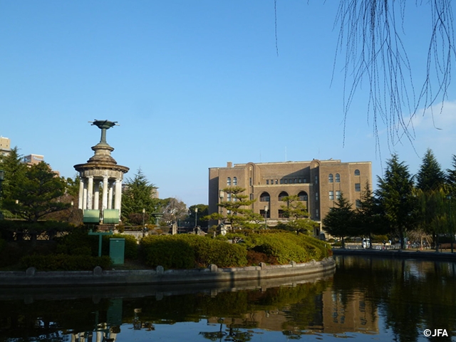 多くの都道府県協会と同様、愛知県でもサッカー施設が不足しています。そうした中、ようやく名古屋市とのフットボールセンター設置に向けた具体的な話し合いが始まりました。候補地は、市の中心にある鶴舞公園。1909(明治42)年に市内に初めてつくられた歴史ある公園です。約23ヘクタールの広大な敷地には重要指定文化財の建造物や図書館、バラ園、テニスコートなどのスポーツ施設があり、緑豊かな都市型公園として市民から親しまれています。