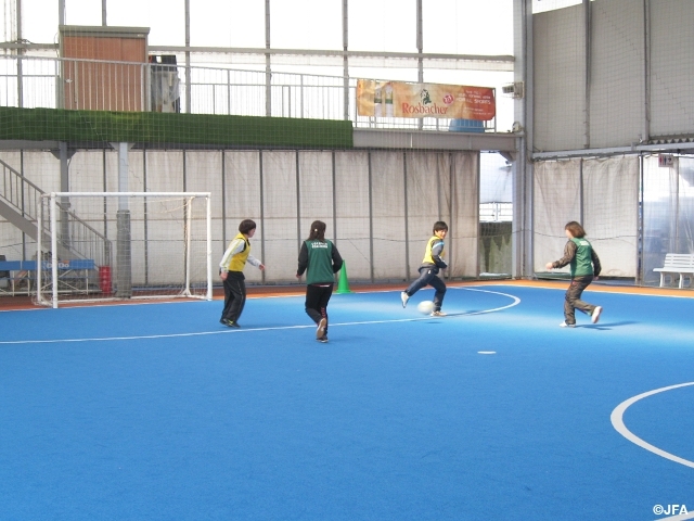 保護者の方とのコミュニケーションや、子供たちがスクールでトレーニングしているプログラムを実際に体験していただく目的でスタートしました。毎月参加してくださる方や、時間ができたときに参加してくださる方など様々ですが、いつもワイワイと賑やかな雰囲気で開催しております。トレーニングを重ねるうちに技術が向上し、テクニックを使って相手をかわす、パスをつないでゴールを決めるなど、素晴らしいプレーが見られるようになりました。また、様々な地域から参加しているため、お互いの情報交換の場となり、新たなコミュニケーションツールのひとつとなっています。今後も継続して開催し、地域の女子チームやママさんチームの発展、普及に繋がるようにしていきたいと思います。