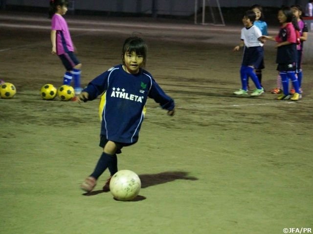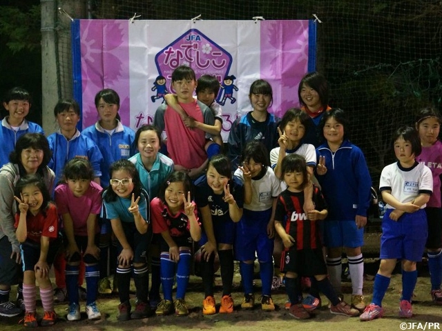 NPO法人イデア・スポーツ・コミュニティが主催する「JFAなでしこひろば」が4月27日(月)、栃木県真岡市で開催されました。この日は20人の女性が集まり、元気いっぱいサッカーを楽しみました。ウォーミングアップでタッチ鬼や手つなぎ鬼を行った後は、対面パスやトライアングルパスの練習、続いてジグザグドリブルやフェイントドリブル等の練習を行いました。最後のミニゲームでは、参加者全員をランダムに分けた10対10のゲームや小学生以下の子どもチーム対中高生のお姉さんチームのゲームを行い、全員で盛り上がりました。これまで参加者の多くは小学生以下の女の子でしたが、最近は徐々に中高生の参加者も増えてきています。地域に女性だけでサッカーをする環境がほとんどない中、「JFAなでしこひろば」は小さな子から中高生まで安心してサッカーを楽しめる貴重な場となっています。