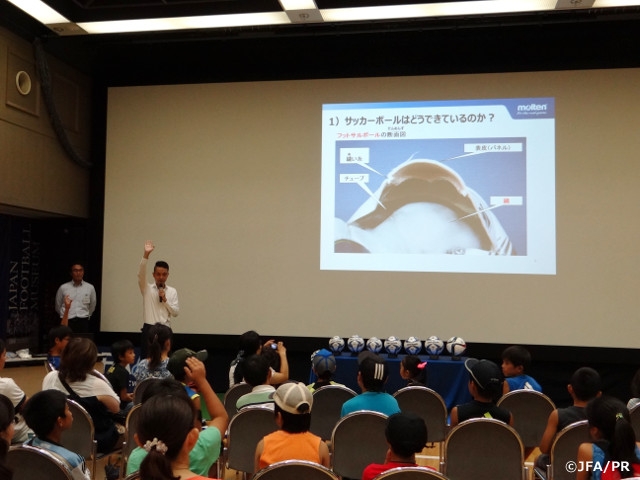日本サッカーミュージアムでは、現在開催している小中学生の自由研究対策イベントの一環として、小中学生のみなさんにサッカーをさまざまな角度から知ってもらうためのトークイベントを実施しています。8月6日(木)、トークイベントの第一弾として「サッカーボールのひみつ」と題し、株式会社モルテンの内田潤さん、中村聡さんにサッカーボールの構造や作り方を実際のボールや断面を切った模型を使いながら分かりやすく説明していただきました。小中学生と保護者約60名が参加し、最後はクイズに挑戦し、楽しくサッカーボールについて学びました。