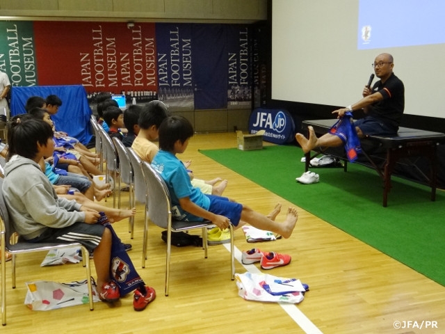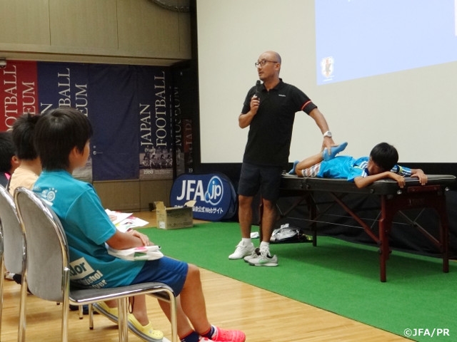 日本サッカーミュージアムでは、現在開催している小中学生の自由研究対策イベントの一環として、小中学生のみなさんにサッカーをさまざまな角度から知ってもらうためのトークイベントを実施しています。8月17日(月)には第7回目のトークイベントを開催し、SAMURAI BLUE(日本代表)アスレティックトレーナーの前田弘さんに、育成年代の選手によくみられるケガと、その予防や処置の仕方についてお話いただきました。また、ケガ予防のためのストレッチや足関節のトレーニング方法を紹介していただき、実際に参加者全員でやってみました。最後は、「日々の生活での行動が、重要なときに必ず出てくる」というオシム元日本代表監督の言葉を引用し、日常の行動がいかに大切かというお話で締めくくっていただきました。