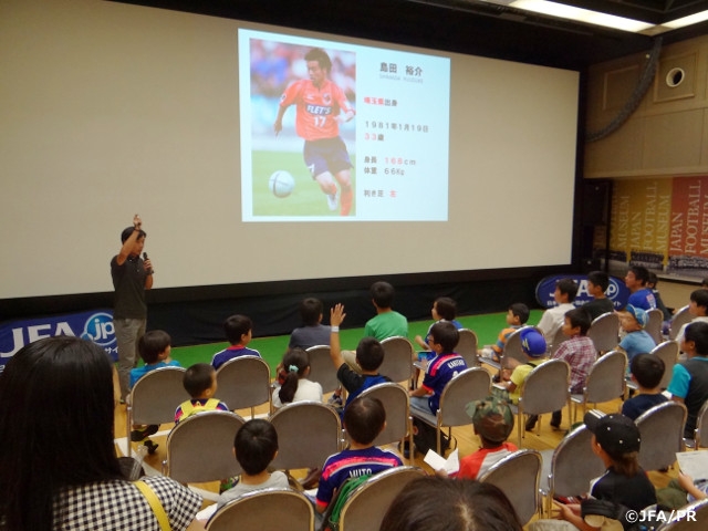 日本サッカーミュージアムでは、現在開催している小中学生の自由研究対策イベントの一環として、小中学生のみなさんにサッカーをさまざまな角度から知ってもらうためのトークイベントを実施しています。8月18日(火)には第8回目のトークイベントを開催し、元Jリーグ選手の島田裕介さんに、プロサッカー選手の1週間の生活サイクルを例に、プロ選手として長くプレーを続けるために子どもの頃からできる大事なことについてお話をしていただきました。