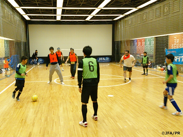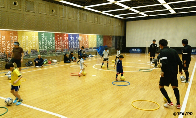 親子フットサルのコーナーでは、キッズから大人までたくさんの参加があり、親子で作ったチームでパスや得点をし、白熱したプレーを見せていました。