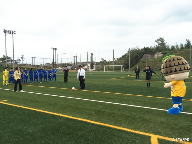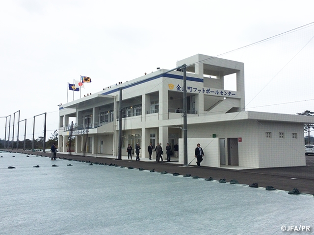 沖縄県金武町に整備を進めてきた金武町フットボールセンターが竣工し、仲間一金武町長や島尻安伊子内閣府特命担当大臣をはじめ、多くの関係者らが出席して、2月27日竣工式が行われました。施設整備助成金を交付している日本サッカー協会(JFA)からは、原博実専務理事が参加しました。
