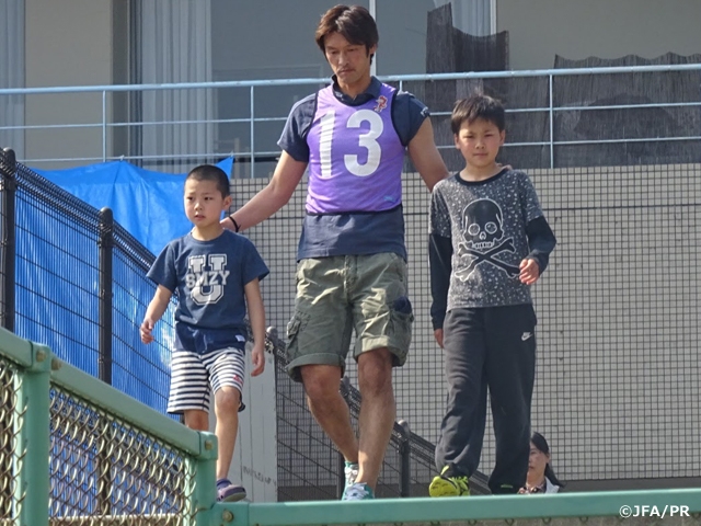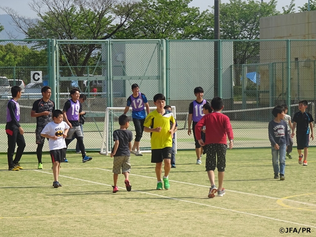 4月14日夜と16日未明に熊本県で発生した熊本地震により、たくさんの方が避難所で生活しています。畑選手と森川選手が身を寄せる避難所において、隣接するフットサル場を使い、集まったロアッソ熊本の選手たちが避難中の子どもたちと一緒にボール遊びをしました。地元の消防団が避難所で過ごしている方々に放送で呼びかけ、サッカー経験の有無や年代にかかわらず、約30名の子どもたちが参加しました。中には遠くから黙って眺めている子どもたちもいたため、ロアッソ熊本FWで元サッカー日本代表の巻誠一郎選手が手をつないでピッチに呼び込んでいました。