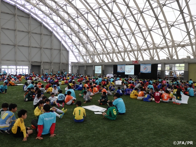 「(公社)富山県サッカー協会 リスペクトワークショップ2016~大切に思うこと~」を4月17日(日)、富山県総合運動公園 屋内グラウンドで開催しました。昨年に続いて2度目の開催となる今年は、昨年同様、県内登録選手約680名(小学校6年生)を対象として行われました。ゲストとして元日本代表の前園真聖さん、カターレ富山の選手も参加しました。