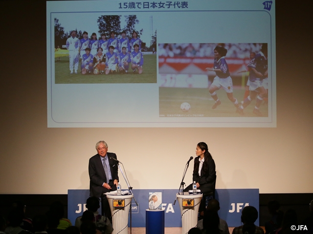 澤さんと親交の深い小倉純二JFA最高顧問が聞き手となり、澤さんの少女時代のサッカーとの出会いから、心機一転で渡ったアメリカでの体験、Lリーグ時代の生活、日本女子代表「なでしこジャパン」としてのオリンピックやワールドカップへの挑戦、ドイツワールドカップでの優勝、バロンドールの受賞、そして惜しまれての引退まで、サッカー選手としての歴史を、映像を交えながら語っていただきました。