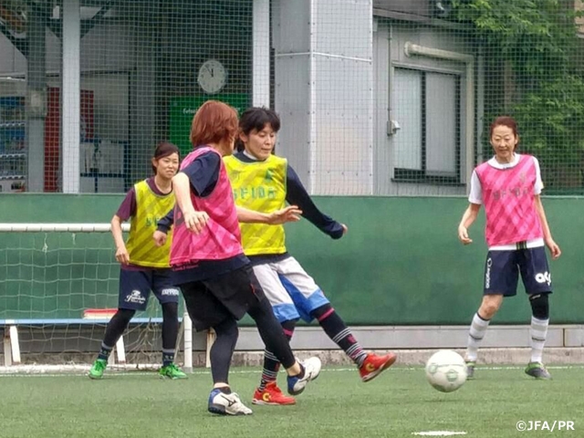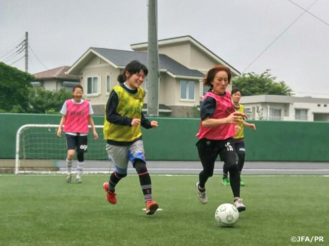 女子サッカーに限らず、サッカーの普及には育成世代だけでなく、その世代の一番近くにいる大人たちへの普及も必要であり、その機会を作ることもJFA公認指導者の役割ではないかと考えています。現在、私は主に大人向けのスクールや社会人チームを中心に指導者活動を行っています。参加者の皆様に楽しんでもらうことももちろんですが、子どもたちに伝える際と同じく、個々のスキルアップやグループでの向上につながる要素をしっかり含んだ内容を意識し、「大人の育成・普及」というスタンスでメニューを構築しています。大人の方々が、まずは自らがプレーし、サッカーの楽しみや素晴らしさを少しずつ、そして深く感じ、スキルアップの術を知ることで、そのそばにいる育成世代に伝わっていけば、普及・育成ともに相乗効果があると信じているからです。