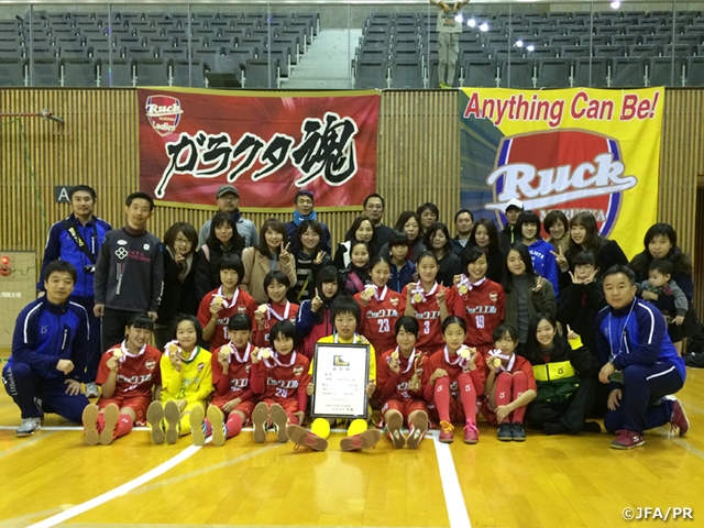 丸岡RUCKレディースは、1991年から福井県を拠点に活動する女子のフットボールクラブです。幼稚園の年中児から小学6年生までが活動するチームでは、2011年の「バーモントカップ第20回全日本少年フットサル大会」で、女子選手だけのチームとして初めて全国大会への出場を果たしました。中学生以上のメンバーは、「全日本女子フットサル選手権大会」で準優勝2回、「全日本女子ユース(U-15)フットサル大会」では3度優勝に輝き、今年2月には日本フットサル連盟が主催する「第3回FUTSAL地域女子チャンピオンズリーグ supported by GAViC」でも日本一になりました。